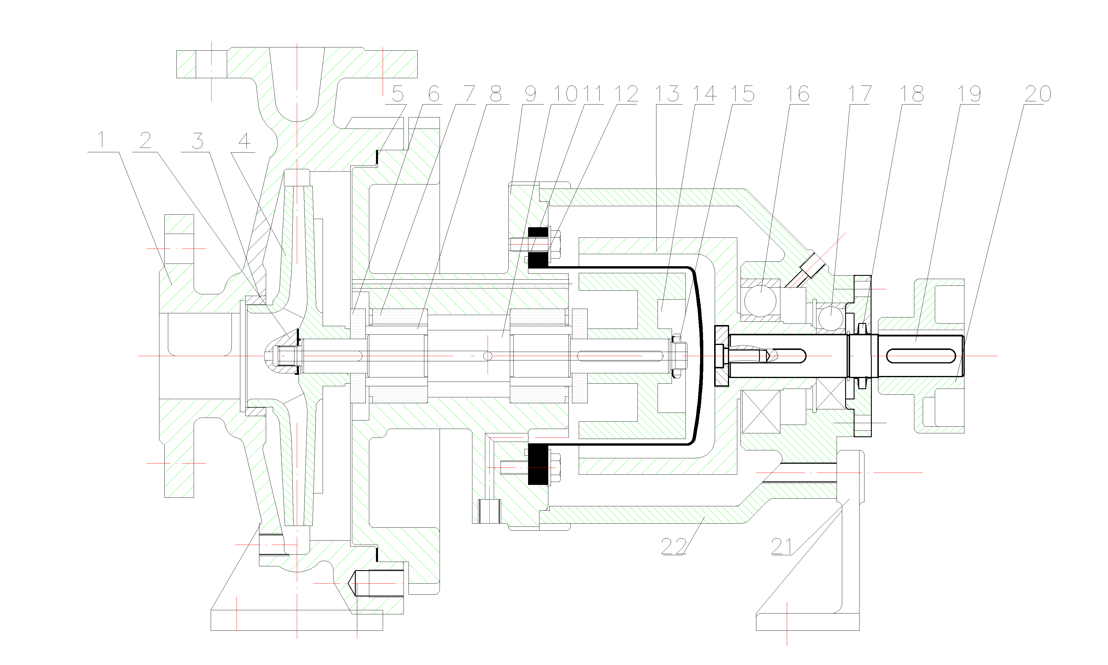 1.Casing 2. Impeller nut 3. Seal ring 4. Impeller 5. Gasket 6. Thrust bearing 7. Journal bearing 8. Shaft sleave 9. Joint 10. Pump shaft 11. Gasket ring 12. Shroud 13. Out magnetic coupling 14. Inner magnetic coupling 15. Nut 16~17. Bearing 18. Oil seal cover 19. Shaft 20. Extended coupling 21. Lift stand 22. Suspension